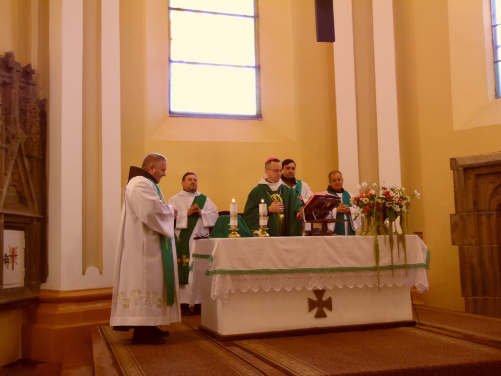 Október 21-én Lucsok Miklós OP püspök celebrált szentmisét koncelebráltak Weinrauch Márió OFM atya nagyszőlősi plébános és egyházmegyénk magyar ajkú lelkipásztorai, akik tovább képzésen vettek részt a Kapisztrán Szent János lelkigyakorlatos házban.