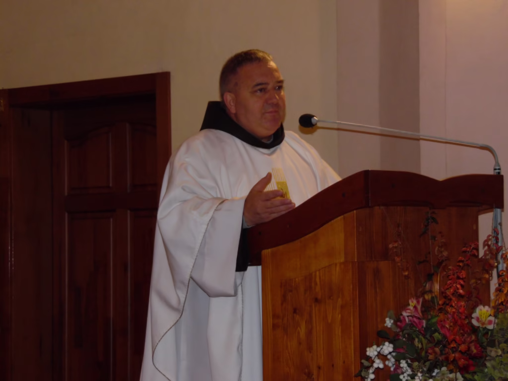 2025. október 19-én Nevetlenfaluban az új óvoda dísztermében a Csíksomlyóról érkezett Böjte Csaba OFM atyával Bán Jónás OFM beszélgetett. A felvételen a nagyszőlősi plébániáról érkező csoporttal láthatjuk.