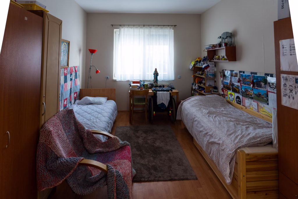 Hegyi Barbara, a lakóotthon vezetője kalauzol végig bennünket az épületen és a birtokon. Ahogy haladunk helységről helységre, elmeséli, hogy az intézmény különlegessége egyrészt a stabil és kiszámítható fenntartásban áll, másrészt abban a komplex szemléletben, amely az ellátás egészét áthatja. „Már hatéves kortól tudunk autizmussal élő gyermekeket fogadni az iskolában, a felnőttellátás pedig – jellegéből adódóan – akár élethosszig tartó biztonságot nyújt. A lakóotthon működése így sok tekintetben egy idősek otthonához hasonlítható, kifejezetten az autizmus sajátosságaihoz igazítva” – magyarázza. Ami a lakókat illeti, az évek során minimális volt a személyi változás, az otthon munkatársai ugyanazokkal az ellátottakkal dolgoznak immár tizenhét éve, szoros együttműködésben a családokkal. Ennek köszönhetően nemcsak a lakók mindennapjait, hanem örömeiket, nehézségeiket, egyéni életútjukat is mélyen ismerik.