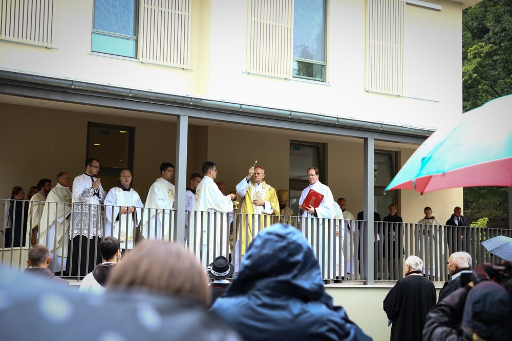 Az ünnepi liturgia a megáldás szertartásával kezdődött. A vízszentelő imádságot követően Erdő Péter bíboros vezetésével a koncelebrálók körmenetben megáldották az új épületeket: a zarándokházat, a szállásépületet, konferenciatermet és a fogadóépületet. Ezután leleplezték a felújítás emlékét megörökítő táblát, majd az ige liturgiájával folytatódott a szertartás.