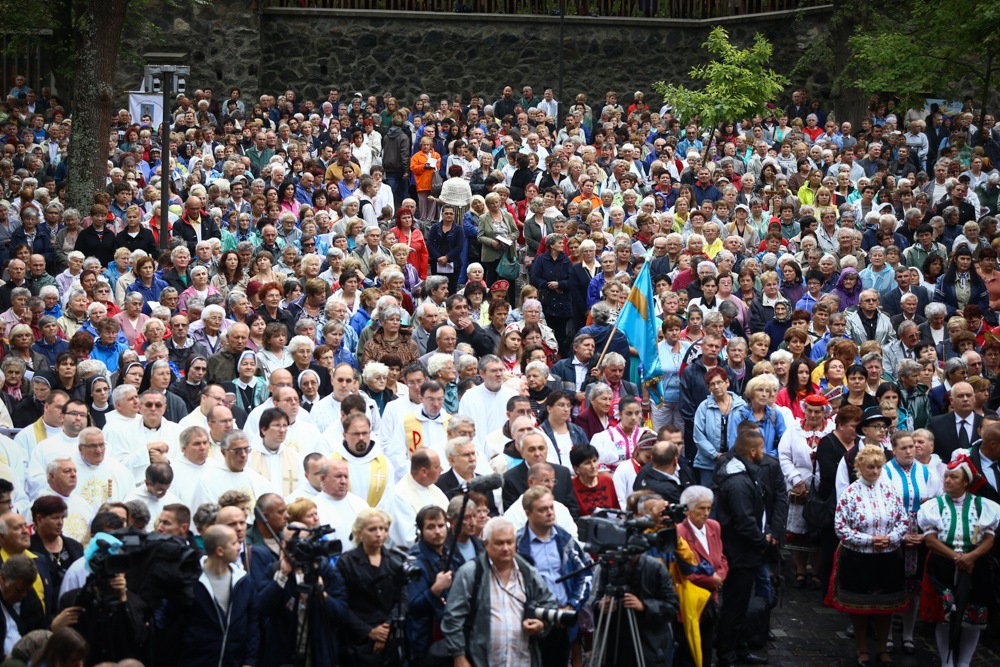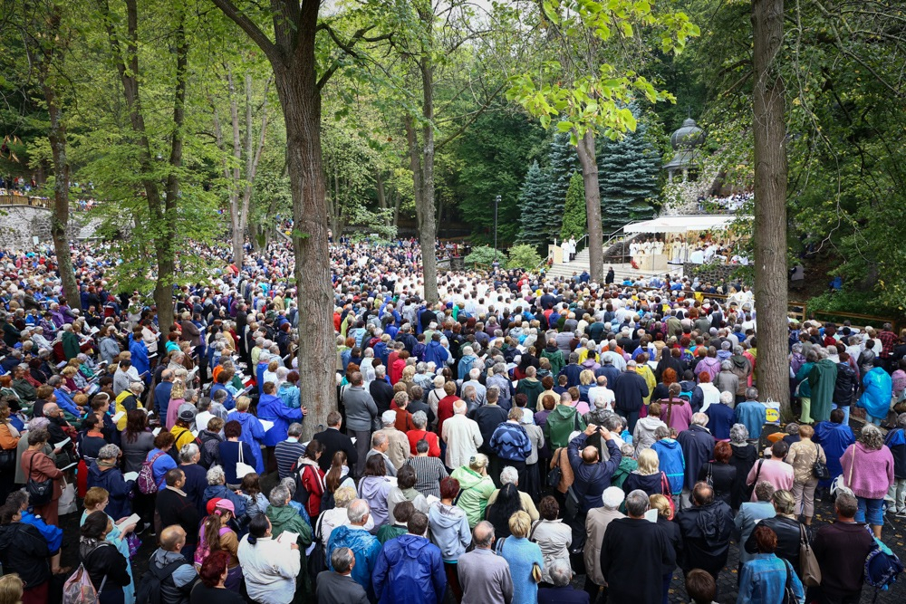 A sűrű esőzés ellenére az ország minden részéből és határon túlról érkezett zarándokok a zsúfolásig megtöltötték a hatalmas miséző teret és az azt félkörben körülölelő magaslatot.