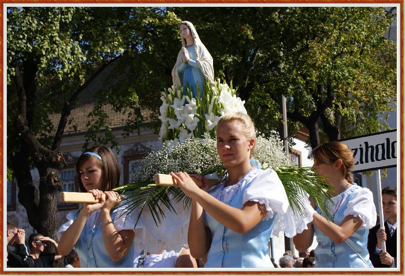 A máriás csoportok fél 9-től egyenként köszöntik a templomban a több mint ötszáz éves Fájdalmas Anya-kegyszobrot, majd felsorakoznak a szabadtéri oltárnál a hordozható Mária-szobrokkal. A szentmise után pedig látványos körmenetet tartanak Gyöngyös belvárosában. A búcsús ünnep záróeseménye 12 órakor a Gyöngyösi úrangyala imádság.