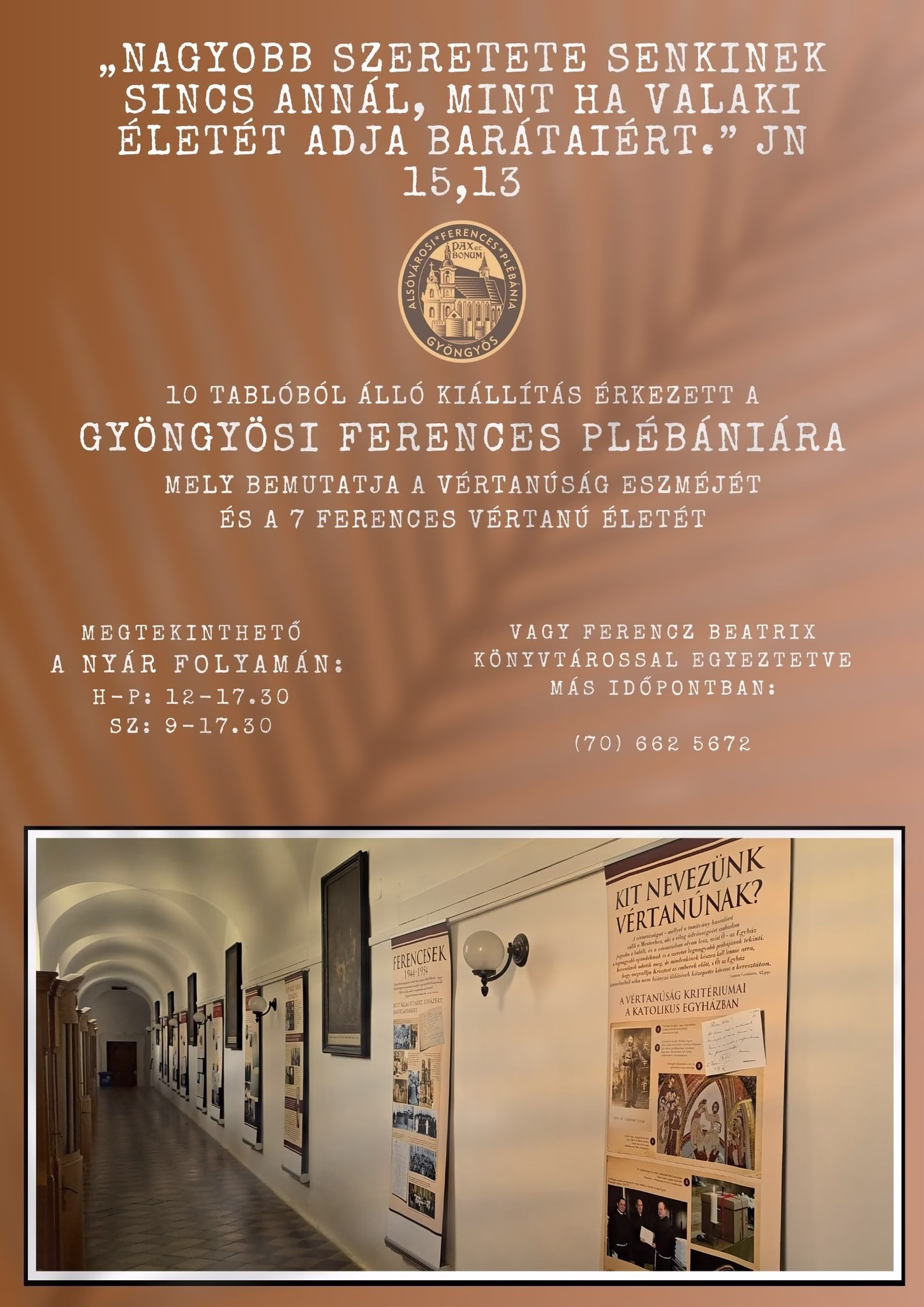 A gyöngyösi ferences plébániára tíz tablóból álló kiállítás érkezett, amely bemutatja a vértanúság eszméjét és a hét ferences vértanú életét. Az időszaki kiállítás a gyöngyösi ferences templom gyóntatófolyosóján ingyenesen megtekinthető Ferencz Beatrix könyvtárossal egyeztetett időpontban, vagy a nyár folyamán hétköznaponként 12.00 és 17.30, szombatonként 9.00 és 17.30 óra között. További információ az alábbi plakáton.