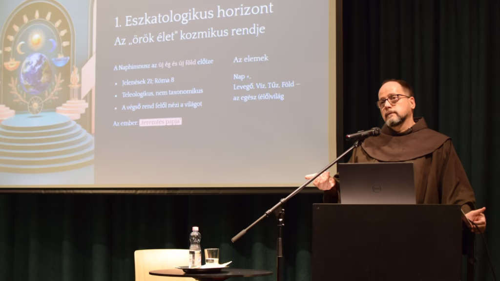E magyarázat szerint Ferenc a Naphimnuszban nem csupán a természet szépségéről szól, hanem egy mély vallási tapasztalatról: a kozmikus liturgia élményéről. Ebben a látomásban az egész teremtés együtt dicséri Istent – az ember, az elemek, az égitestek és az állatok mind egy nagy kórus tagjai. „A Naphimnusz a teremtés nagy kórusába illeszti be az embert, ahol minden teremtmény – akár szóval, akár létezésével – együtt zengi Isten dicsőségét” – zárta előadását Ágoston atya.