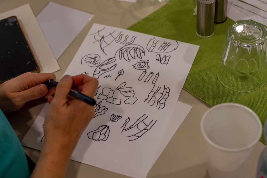 Az elgondolkodtató előadás után Milán atya zenés kreatív kiscsoportos foglalkozást tartott, ahol a testvérek és nővérek üvegfestékképeket készítettek a Naphimnusz elemeihez kapcsolódóan, Kákonyi Asztrik atya munkáiból inspirálódva.